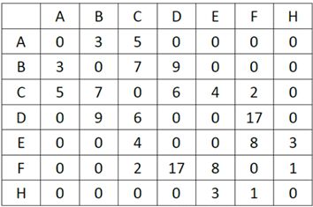22. 假設圖 G 有 7 個節點,節點之間的鄰接矩陣 (adjacency matrix) 如下,鄰接矩陣內的數值代表節點之間的距離, 若節點之間的距離為 0 則代表節點不直接相連。如果以節點 H 為起點,利用廣度優先搜尋法 (breadth-first search) 走訪圖 G,而且走訪次序相同的節點以距離近者優先走訪。試問走訪完畢後,所走訪的距離為何?