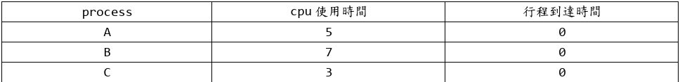37. 有一作業系統採用 Round Robin (R.R) 算法,time slice= 5ms,有 A、B、C 行程的到達時間與 CPU 使用時間, 請計算平均等待時間 (A.W.T)