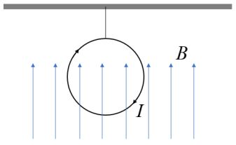6. 如圖所示,一圓形線圈半徑 R,重量 W ,以絕緣細線懸掛之,置入鉛直向上之均匀磁場 B 中,今將此線圈通以電流 I , 且此線圈受力後不變形,平衡後此線圈之線圈面與鉛直面之夾角為 θ,則 tanθ 為 【6】 。