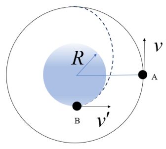 7. 如圖所示,一半徑為 R 的行星,有一離地高度亦為 R 的衛星 A,以速率 v 環繞該行星轉動。假設行星本身沒有自轉,今在該行星表面上沿水平方向發射一枚火箭 B,欲與衛星 A 會合。忽略所有阻力,若火箭發射後,即不再具有動力, 則火箭 B 在發射時的速率 v' 的最小值需為 【7】 。