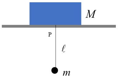 12. 如圖所示,一質量為 M 的均勻方塊可以在一對水平的光滑軌道上滑動,在其底部中心點 P 的正下方以長度為的輕繩, 懸掛一質量為 m 的小圓球作為擺錘。若起始時將擺錘拉緊,使擺錘自軌道的水平位置自由擺下,則此單擺所達到的最大角速率為? (重力加速度為 g ) 【12】