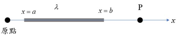14. 如圖所示,電荷均勻分布在一條導線上,每單位長度的帶電量為λ 。此導線從 x=a 延伸到 x=b ,則在距離原點 x 處 P 點的電位為【14】。(真空中電容率為ε0 )