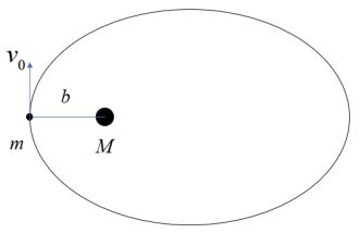 16. 如圖所示,萬有引力常數為 G , M 位置固定, m 和 M 的距離為 b 。忽略所有阻力, m 以初速 v0 垂直於兩星球連線方向射出,若初速v0= ,則 m 繞 M 作橢圓運動的週期為 【16】 。