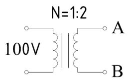 62. 如下圖所示變壓器之線圖比為 1:2,於一次測電壓為 AC100V,請問 2 次測 AB 端之電壓為幾伏特?