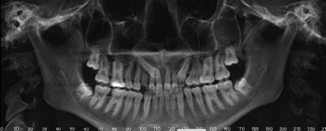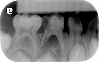 35.5歲男童因右下牙痛求診,拍攝之放射線影像如圖所示;先注射2% lidocaine with 1:100,000 epinephrine後開始後續處置,下列何者錯誤? (A)第一乳臼齒不宜施行活髓治療(vital pulp therapy) (B)第一乳臼齒可考慮拔除 (C)第一乳臼齒牙根吸收非生理性現象 (D)該麻醉藥物的最大劑量是6.0 mg/kg