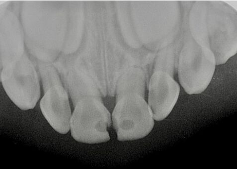40.3歲男童因牙齒缺損及變色前來求診,拍攝放射線影像如圖示,下列敘述何者正確? (A)左側上顎正中乳門齒發生牙根內吸收 (B)左側上顎正中乳門齒牙冠應呈粉紅色 (C)此案例牙根吸收的原因可能是外傷 (D)此案例的診斷為根管堵塞(obliteration)