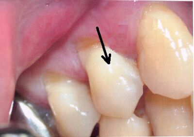 72.根據世界衛生組織(WHO)2013年出版的口腔健康調查基本方法(Oral health surveys, basic methods)第五版標準,下圖箭頭所指的牙齒,其牙齒狀況應記錄為何? (A)健康(sound) (B)齲蝕(caries) (C)外傷(trauma) (D)不予記錄(not recorded)
