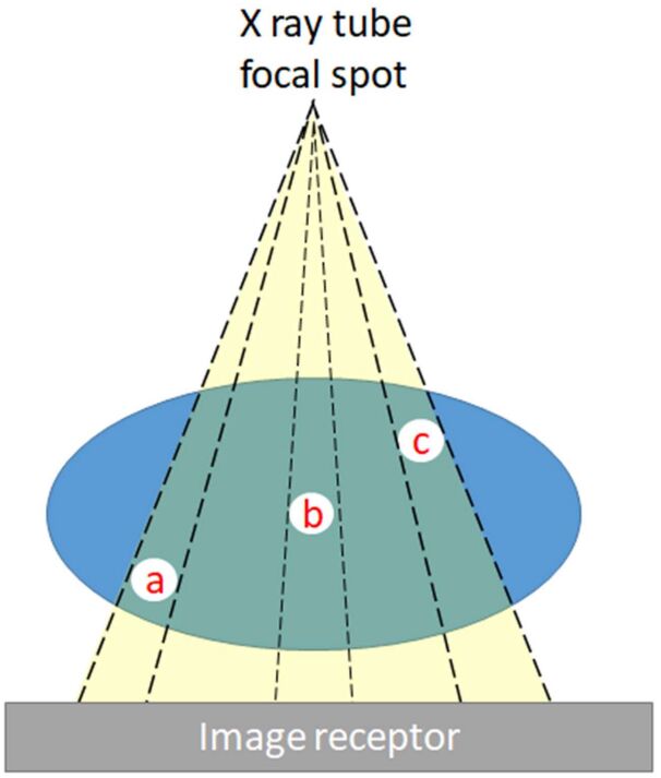 17.如圖所示為診斷用X光機的成像配置,其中目標物a、b與c具相同尺寸,下列敘述何者正確?(A)目標物a在影像接收器上有最大成像 (B)目標物b在影像接收器上有最大成像 (C)目標物c在影像接收器上有最大成像 (D)目標物a、b與c在影像接收器上有相同成像