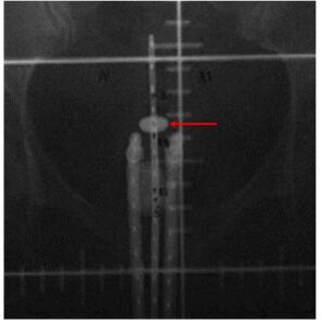 55.子宮頸癌病人接受HDR治療,連管放置好之後拍攝的X光片如圖所示,如果醫師裝置與固定的非常恰當,病人也沒亂動,則圖中箭號所指示之白色盤狀物對應到的生理組織為:(A)陰道側穹窿(lateral vaginal fornix)(B)外子宮頸口(external cervical os)(C)內子宮頸口(internal cervical os)(D)子宮體(uterus corpus)