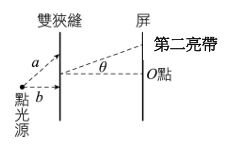 6. 將一點光源波長為5000Å之單色光照射一雙狹縫,雙狹縫相距0.02cm,點光源發出的光至兩狹縫之光程差a − b=2500Å(如圖所示),則此光在距狹縫80cm屏上之第二亮帶中線(中央線上方),對雙狹縫中點所張的角度θ約為______________rad