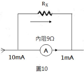 4. 如圖10所示,有一電流表其內阻為9歐姆,滿刻度偏轉電流為1mA,其並接分流器電阻 一等大管輪試卷值為多少歐姆?