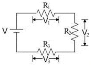 20. 如下圖之電路,電壓V=15伏特 ,R1=18Ω ,R2=12Ω ,R3=15Ω ,由克希荷夫電壓定理可知通過R3的電壓降為