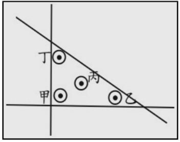 38. 於大比例尺海圖上(1:200000),以位置線定位時描繪出如圖每邊小於5mm近似直角的誤差三角形,則下列圖示的位置何者為較佳的船位 ? (A)甲 (B)乙 (C)丙 (D)丁