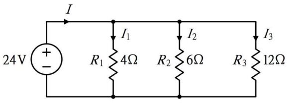 (A)等效電阻為 1Ω (B)電流I為 12A (C)I1=6A、I2=4A、I3=2A (D)電壓源供給的功率為 300W 。