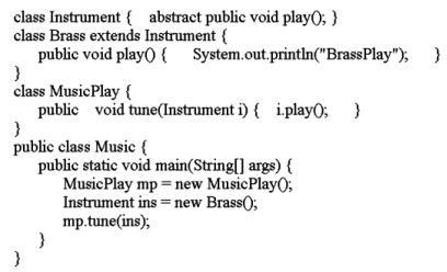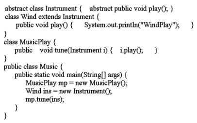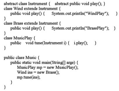 (A)WindPlay (B)BrassPlay (C)無法編譯,因為 Instrument 類別設定為 abstract (D)無法編譯,因為 Brass物件不是 Wind 類別 。
