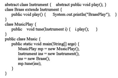 (A)無法編譯,因為 Instrument物件不是 Brass 類別 (B)BrassPlay (C)無法編譯,因為 Instrument 類別設定為 abstract (D)無法編譯,因為 Instrument 類別的 play()方法沒有設定為 abstract 。