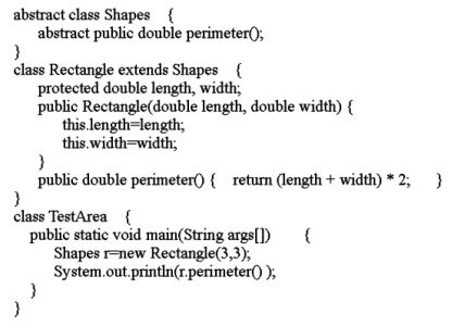 (A)無法編譯,因為 Shapes 物件不是 Rectangle 類別 (B)12.0 (C)無法編譯,因為 Shapes 類別設定為abstract 而無法產生 Rectangle 物件 (D)0 。