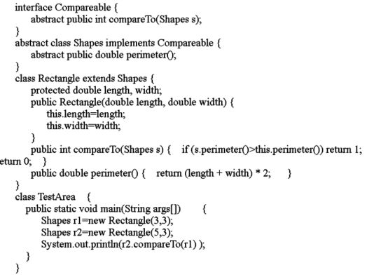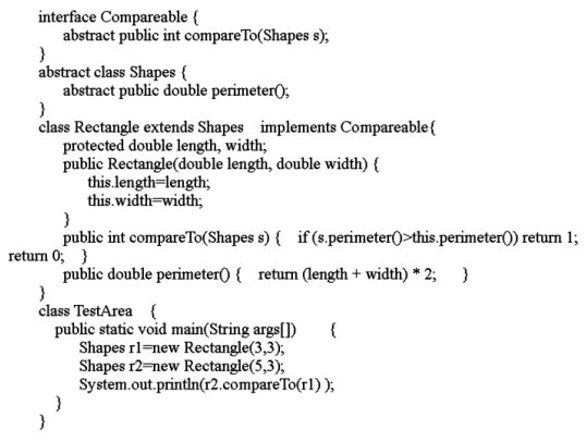 (A)無法編譯,因為 Shapes 類別不能 implements Compareable (B)1 (C)無法編譯,因為 Shapes 類別設定為 abstract 而無法產生 Rectangle 物件 (D)0 。