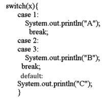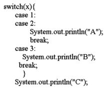 79. 一 Java 程式片段如下,當 x 數值為何時會印出"B"?