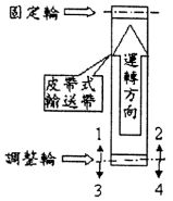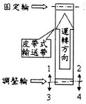 (A)兩輪軸中心線不平行,左邊大右邊小,往 1 或 4 方向調整 (B)兩輪軸中心線不平行,左邊小右邊大,往 2 或 3 方向調整 (C)皮帶太緊,往 1、2 方向調鬆 (D)皮帶太鬆,往 3、4 方向調緊