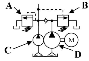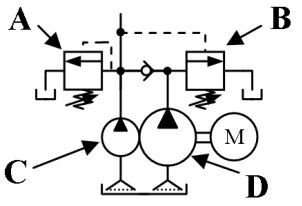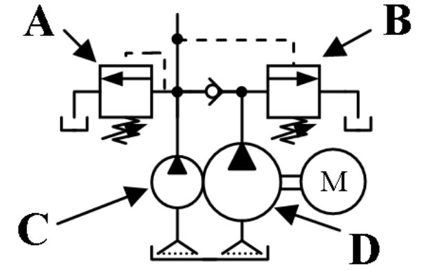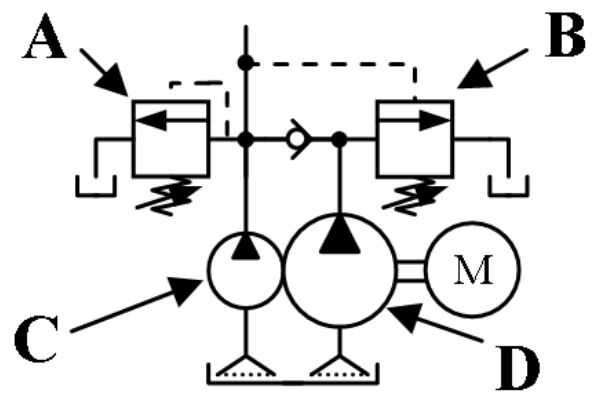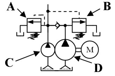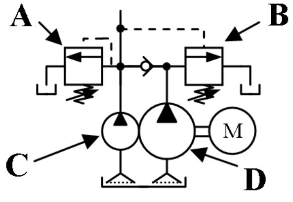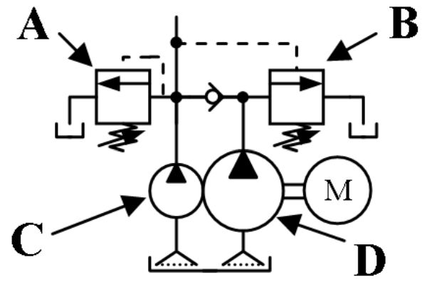 (A)小流量泵浦 (B)大流量泵浦(C)溢流閥 (D)卸載閥 。