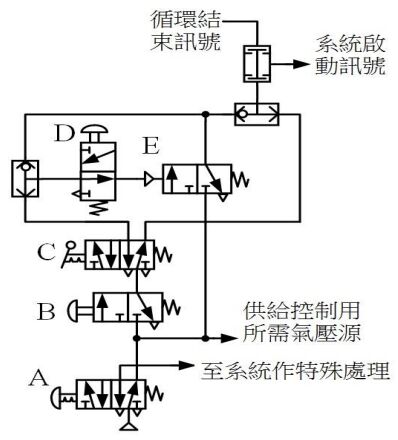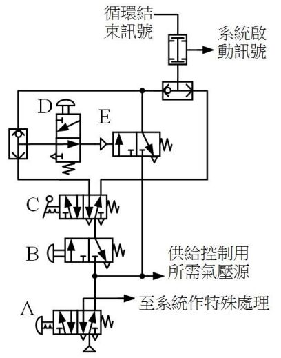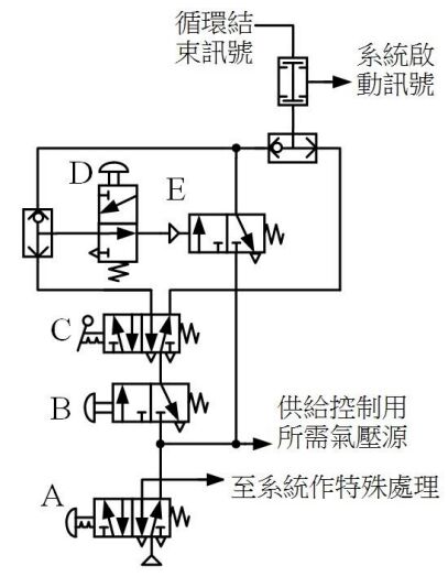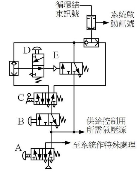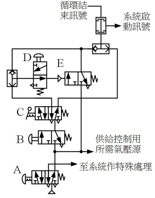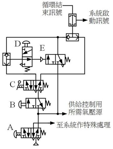 (A)A 為緊急停止鈕 (B)B 為啟動鈕 (C)C 為停止鈕 (D)E 為連續循環保持閥 。
