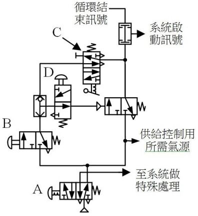 141. 如下圖所示,在按閥件 B 啟動後,若僅切換閥件 C,系統會有下列哪些功能敘述正確?