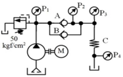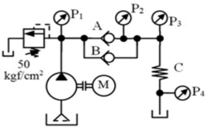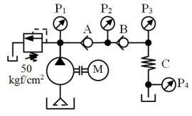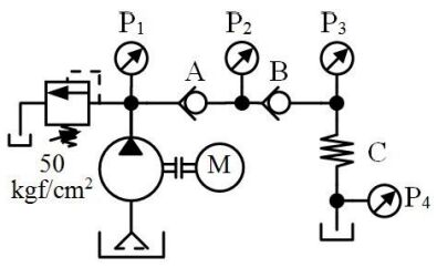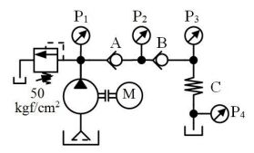 147. 如下圖所示,管路阻力忽略不計,在溢流閥設定壓力 50 kgf/cm2 、額定流量 20 l/min 時,止回閥 A、B 開啟壓力分別為 3、2 kgf/cm