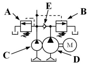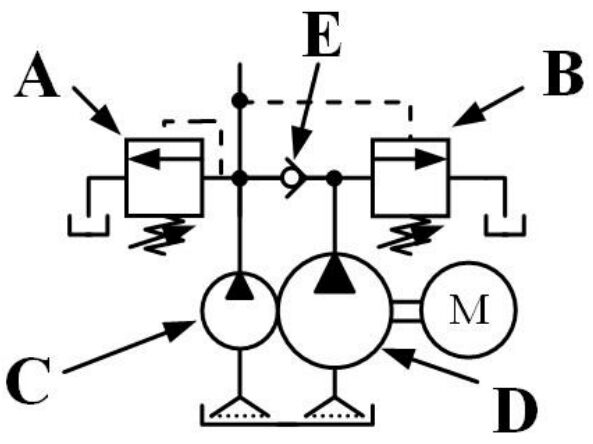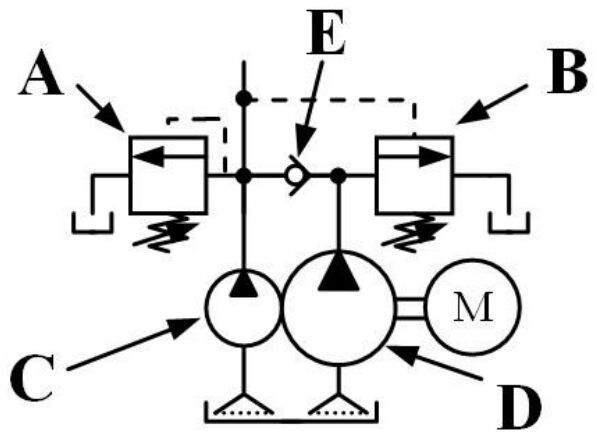 152. 如下圖所示,有一組油壓系統供應泵浦,如 C 元件輸出流量 5 l/min、D元件輸出流量 30 l/min、A 閥件設定壓力 100 kgf/cm