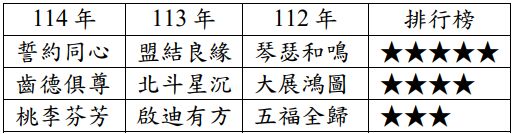 (A)三年的冠軍皆屬於婚嫁類題辭 (B)三年皆有感謝師恩教導的題辭 (C)113、114 年題辭皆有祝賀女性壽星 (D)112、113 年題辭皆適用於喜慶場合