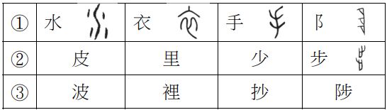 (A)第①列的四個字都是指事字,皆為第③列的部首 (B)第②列的四個字,分別為第③列四個字的形符 (C)第①列還可和「皮」組成形聲字「被」、「披」、「陂」 (D)第②列的「步」是「止」和「少」組成的會意字
