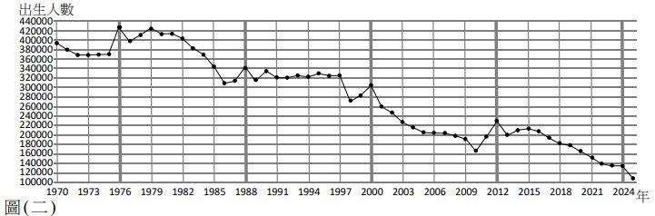 (A)1976、1988、2000 這三年(龍年)的出生人數相較於其前一年(兔年)、後一年(蛇年)來得多 (B)1970 年到2025 年,出生人數的全距大於30 萬人 (C)2008 年到2016 年,出生人數的中位數為229481 (D)2017 年到2025 年,每一年的出生人數逐年減少