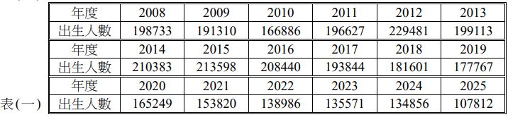16. 從國家發展委員會人口推估查詢系統可查詢到出生人數折線圖如,2008 年到2025 年出生人數統計值如表 ( 一 )。根據及表 ( 一 ) 中的數據,判斷下列選項何者錯誤?