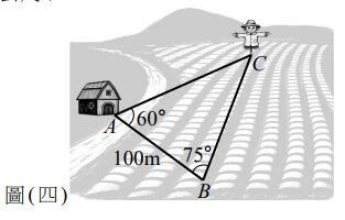 20. 阿雄想測量農地裡一個稻草人C 到工寮A 的距離,如所示。他先在A 點和田埂上 另一處B 點拉出基準線,測得A、B 兩點的距離為100 公尺,接著測得角度∠CAB = 60°, 以及∠CBA = 75°。試求A、C 兩點的距離為多少公尺?