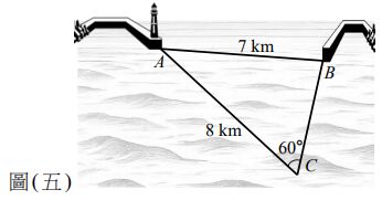 21. 探勘人員為確認一個新的優良漁場C 與港口B 的距離,從港口A 直線航行8 公里到漁場 C,此時在C 點經由儀器測定角度得知∠ACB= 60°,且港口A 與港口B 相距7 公里,如圖 ( 五 ) 所示。若B、C 的距離大於4 公里,則B、C 的距離約為多少公里?