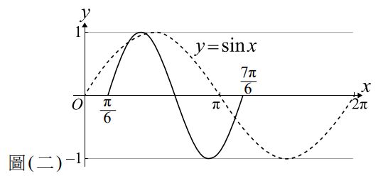 15. 若圖(二)中的實線是虛線y=sinx函數圖形經過平移與伸縮後的圖形,則圖(二)中的實線是下列哪一個函數完整一個週期的圖形? (A) (B)(C)(D)