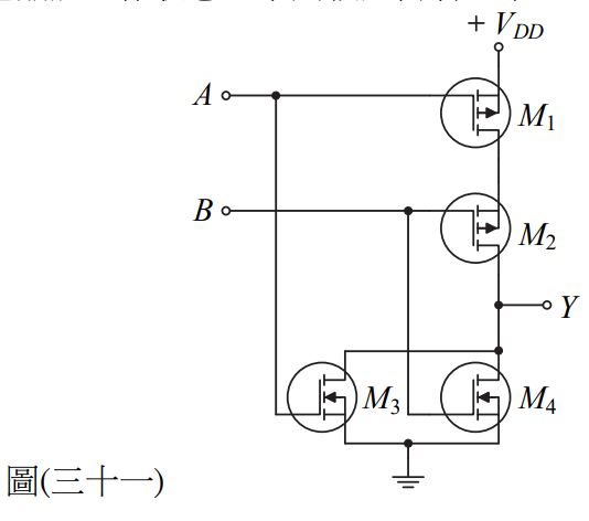 48. 如圖(三十一)所示CMOS數位邏輯電路,若邏輯1為高準位( +VDD),邏輯0為低準位(0 V),當輸入A、B皆為邏輯1時,則有關各電晶體工作狀態,下列敘述何者正確? (A) M1、M2 為截止狀態, M3、 M4 為導通狀態 (B)M1、M2為導通狀態,M3、 M4為截止狀態 (C) M1、M4 為導通狀態,M2 、M3為截止狀態 (D)M1、M4為截止狀態,M2 、M3為導通狀態