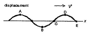 5. A simple harmonic wave is propagating to the +x displadement direction on a string as shown in the right figure. The vertical displacement is actually very small, i.e. not to nestale is correct?(A) A has max. kinetic energy (B) B has max. kinetic energy (C) C has max. potential energy(D) D has max. potential energy (E) E has min. kinetic energy