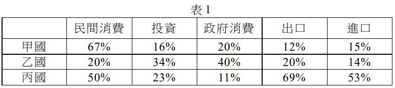 5. 某生蒐集了甲、乙、丙三國近 10 年各項支出占 GDP 比例的平均資料(表 1),想要比較各國的經濟發展型態與規模。下列哪項敘述最能解釋表 1 的資訊?(A)甲國消費占比最高,國際貿易占比最低但仍為順差 (B)乙國服務業占比最低,最重視政府與民間投資支出 (C)丙國國際貿易總額最高,但國內總消費占比卻最低 (D)丙國的各項占比加總最高,屬於經濟實力最強國家