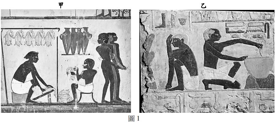 12. 考古出土的墓室壁畫是重要的歷史研究材料。圖 1 是埃及考古挖掘出的墓室壁畫,其中甲圖描繪僕人正在處理禽肉;乙圖描繪僕人正在調製醬汁及製作麵包。上述壁畫內容可 作為研究哪項歷史課題的資料? (A)古代社會階層分化與物質生活 (B)宗教祭司與信徒間的互動關係 (C)宗教輪迴轉世觀與社會倫理觀 (D)傳統王權統治與神權思想結合