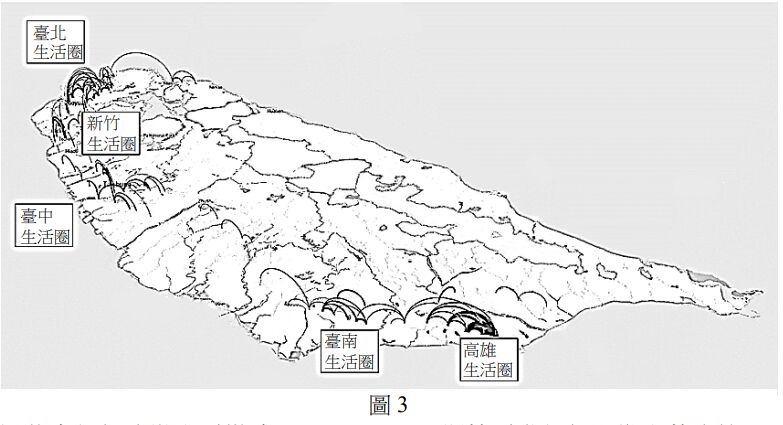18. 某生利用高速公路電子收費系統在通勤時段的流量資料,探究臺灣地區民眾的活動範圍。他將汽車進入與離開高速公路的起迄資料繪製於地圖上,並根據資料在空間上的密集程度,定義數個生活圈。圖 3 是起迄資料與生活圈的呈現結果。下列何者最適合成為該探究活動的標題?(A)資訊革命如何改變生活模式 (B)運輸活動如何影響聚落系統(C)路網型態如何加速人口遷移 (D)交通革新如何造就都市機能