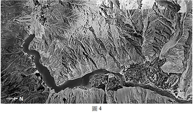 19. 圖 4 為南亞某河川因大規模土石滑落阻擋河道而形成的堰塞湖。湖水目前已自天然壩體上方溢流,但壩體整體結構仍屬穩定,暫無潰決之虞。圖中顯示的堰塞湖溢流方向, 最可能指向下列哪個方位角? (A)0° (B)90° (C)180° (D)270°