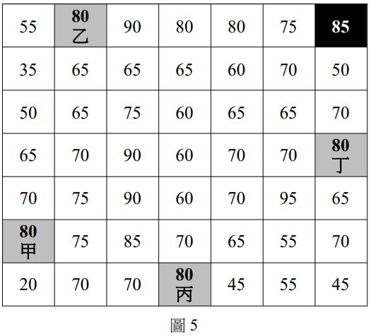 20. 某生玩一款手機遊戲,其中一個關卡需要先利用射程 200 公尺的狙擊槍來癱瘓某座碉堡頂端的探照燈,而且若走入該碉堡半徑 40 公尺的範圍內,則會被碉堡內的 士兵發現並遭到反擊。圖 5 是該關卡的地圖,每個網格為 10 公尺的正方形, 網格內的數值代表高度,黑色網格為 碉堡所在位置,灰色網格為射擊地點候選位置。若要成功過關,該生選擇 下列哪個網格作為射擊地點最為理想? (A)甲 (B)乙 (C)丙 (D)丁