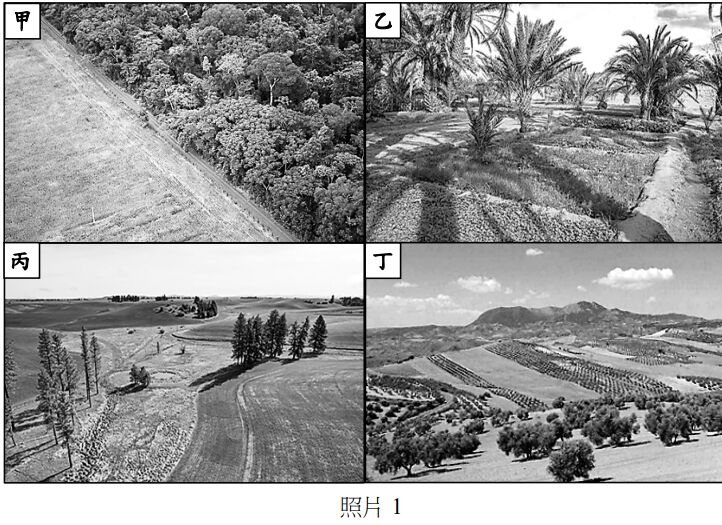 22. 2024 年在聯合國森林論壇中,有代表指出「農業是全球森林砍伐的重要驅動因素,應列入會議文件」,但某國代表則要求將「農業」移除在外。主因是該國為求經濟發展,長期砍伐森林,開闢肉牛放牧場和飼料農地。當地土壤層雖深厚,但實為貧瘠,因暴雨 頻繁,在無森林保護下,養分流失更快。上述的農業景觀最可能是照片 1 中的何者? (A)甲 (B)乙 (C)丙 (D)丁