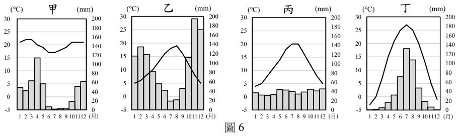 23. 臺灣有咖啡店家自某國進口咖啡豆,烘焙出獨特風味咖啡。已知該國咖啡豆主要分為兩類,一類分布在維多利亞湖附近,果實碩大、口味甘甜,另一類則分布在全國其餘各地,並以吉力馬札羅山腳地區所生產帶有柑橘、莓果味的阿拉比卡豆為最有名。圖 6 是四個測站的氣溫雨量圖,哪個測站最可能位於該國出名的阿拉比卡咖啡產區? (A)甲 (B)乙 (C)丙 (D)丁