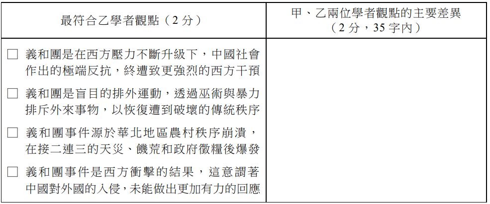 44. 依據題文,若以義和團事件為例,下列何者最符合乙學者觀點?請在答題卷勾選一個正確選項,並說明甲、乙兩位學者觀點的主要差異為何?(4 分)