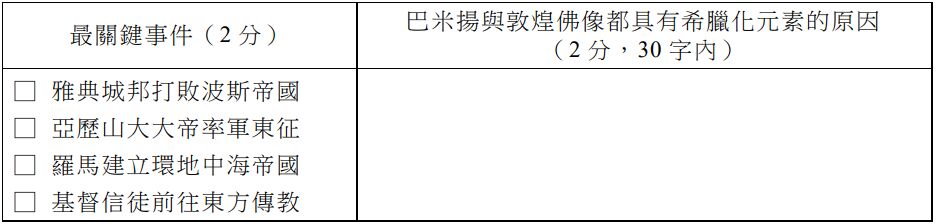 46. 題文提到「希臘化」,促使該現象得以在中亞地區形成的最關鍵事件為何?請在答題卷勾選一個正確選項,並說明巴米揚與敦煌的佛像都具有希臘化元素的原因為何?(4 分)