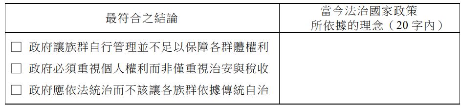56. 依據題文,該高中生反思後作成什麼結論,最符合其探究的角度?請在答題卷作答區表格內左欄勾選一項最符合之結論,並在右欄依據題文填寫當今法治國家政策所依據的理念。(3 分,左欄勾選正確,右欄始計分)
