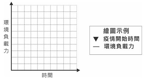 63. 生態平衡是一種動態平衡,若在自然環境、生產內容、生產技術不變的情況下,以題文中提到疫癘對古代社會的影響為案例,在答題卷作答區繪製出「此疫情開始」前後,該地環境負載力的可能變化示意圖。(3 分)