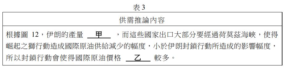 65. 根據題文資訊,若該學者以供需架構比較兩國行動對國際原油價格的影響,最可能的結論是什麼?其完整的供需推論內容如表 3,但仍留有甲、乙二項空格區。請在答題卷甲空格區填入適當文字,再於乙空格區勾選正確選項,以完成整個論述。(3 分)